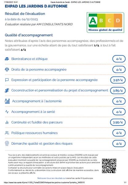 Comme vous le savez sans doute, la résidence Les Jardins d'Automne à Badecon le Pin a fait l’objet d’une évaluation externe sur la base du référentiel de la Haute Autorité de Santé le 4 décembre 2023, conformément aux exigences réglementaires en vigueur.